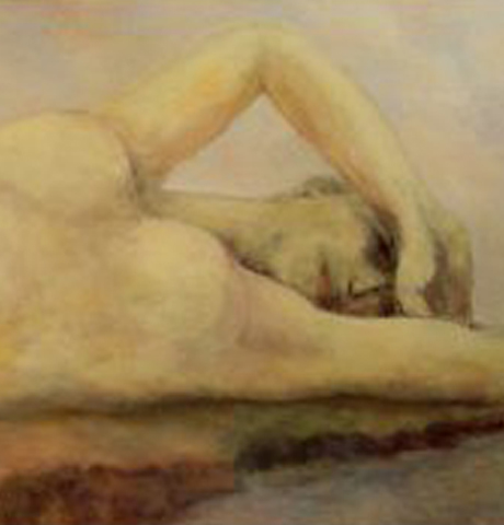 A classic treatment of the reclining odalisque with modern compositional approaches. She lies in landscape, coolly looking out. [private collection]